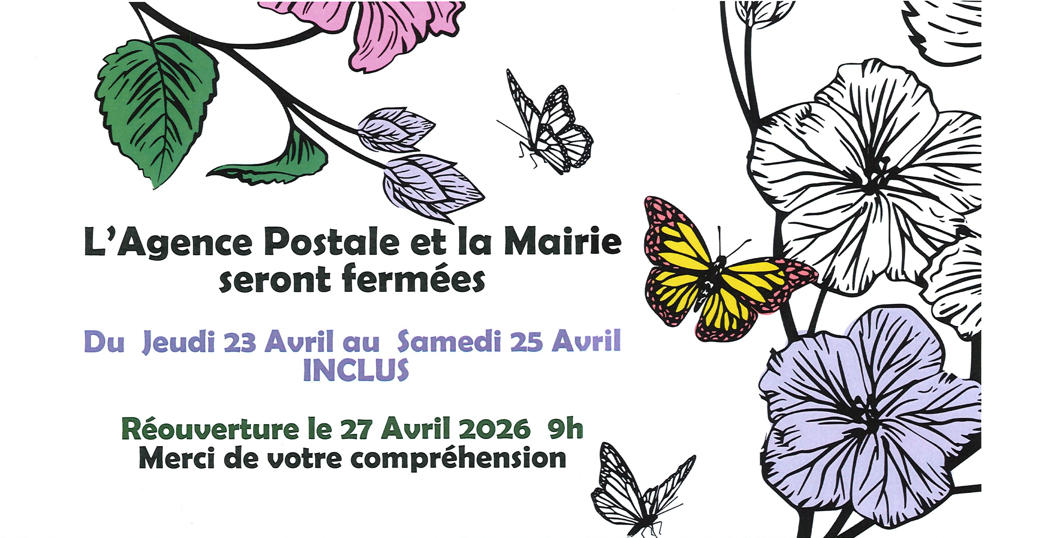 Mairie, Agence Postale du Jeudi 23 au Samedi 25 Avril INCLUS
